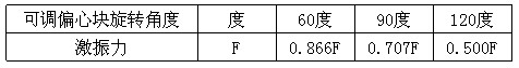 振動電機每端出軸均有一個固定偏心塊和一個可調偏心塊,調節(jié)可調偏心塊和固定偏心塊之間的夾角可改變激振力的大小。出廠時可調偏心塊和固定偏心塊之間的夾角為0度,這時的激振力為振動電機的額定激振力F,不同夾角時的激振力如表: